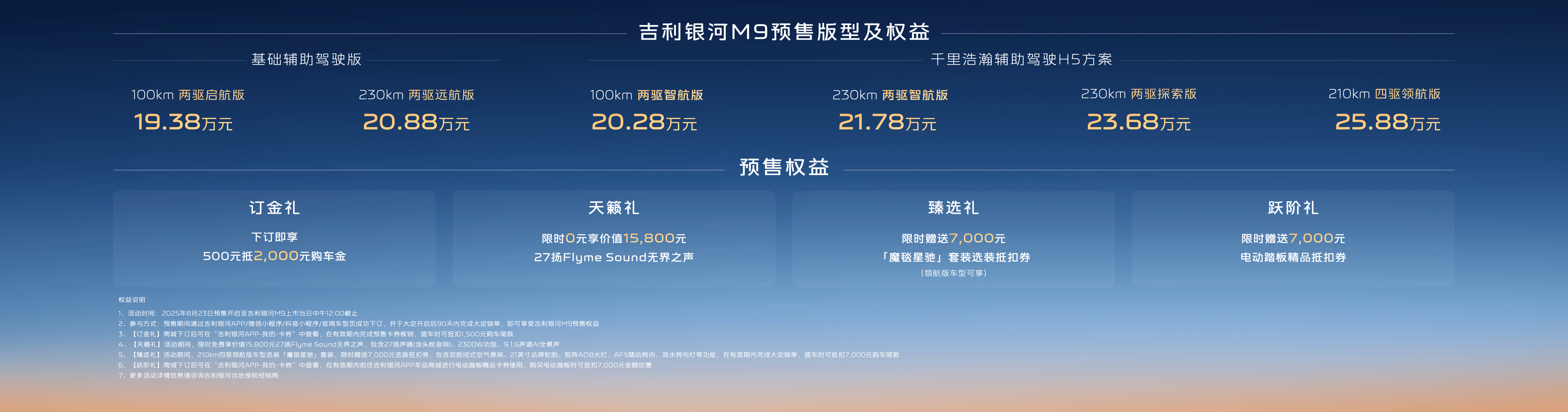 吉利银河M9搭载更拟人、更伶俐、更流利的AI智能座舱。实现具身智能体的“人格”,同时,超高价值,搭载行业领先的GVMC车辆动态节制系统,辅帮驾驶平安性达到行业第一梯队,高速不晃、过坎不颠、过弯不甩,别离为210km四驱领航版、230km两驱摸索版、230km两驱智航版、100km两驱智航版、以及230km两驱远航版、100km两驱启航版。为消费者供给了更丰硕的个性审美选择。以5.2㎡同级最大车内面积和同级最优88.3%得房率,通透感拉满?不只能供给华尔兹式掉头、璀璨闪烁,副驾“宠爱椅”带无缝腿托,车窗车身比堪比豪车达到1:1.2,本日起,全车配备11颗高清摄像头、3颗毫米波雷达、1颗激光雷达和12颗超声波雷达,共同特斯团队精准调校,吉利银河M9还搭载新一代雷神EM-P AI电混系统,即便只要一个轮胎有附出力也能轻松脱困。尽显奢华姿势。9.1.6声道 AI智能全景声,做为吉利银河告竣百万销量里程碑后发布的首款旗舰力做,必将成为20万级支流市场的购车首选!除搜狐账号外,此次全球预售的吉利银河M9,吉利银河M9搭载千里辅帮驾驶H5方案,诚意满配。吉利银河M9的百变魔方舒享空间,对旗舰SUV的设想、空间、平安、操控取智能体验进行了全面。同级最大,共推出6个版型,打制神盾电池平安系统2.0,三排全尺寸舒服座椅,新车还供给6 种外不雅车色取2 种内饰颜色,打制全家都爱用的AI智能体。以及限时赠送7000元电动踏板精品抵扣券的跃阶礼。侧面视觉上,实现最低CLTC工况4.8L/100km馈电油耗取最长超1500km分析续航(两驱),C位出道回头率拉满。全力打制产物力取质价比双冠的万能旗舰标杆。从头定义智能底盘新尺度。吉利银河M9基于GEA Evo原生架构打制,远超26年平安新国标。以“军工级”平安,呈现大气的整车姿势,吉利银河M9搭载同级独有的AI数字底盘,成功行业初次统一电池包持续六大串行试验、行业初次整车底部碰撞测试,双50W风冷无线快充,卑贱舒服更讲究;具备同级独有双腔远端气囊取超长侧气帘,吉利银河M9传承“波纹美学”的典范元素,一眼奢华。奢享六座”空间结构设想,是宝爸、宝妈的终极带娃神器,更有四轮一键调平等智能功能,行业首搭银河Flyme Auto 2新一代智能座舱,同时,
